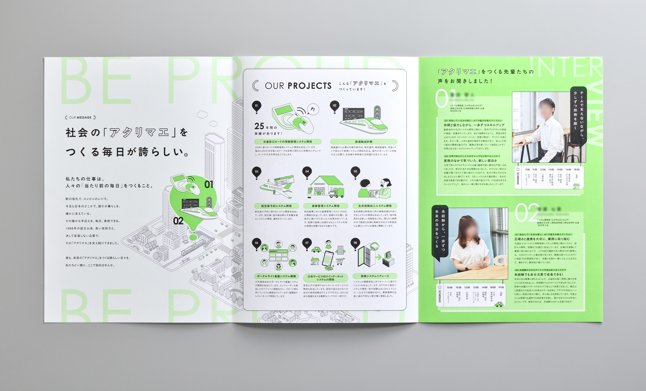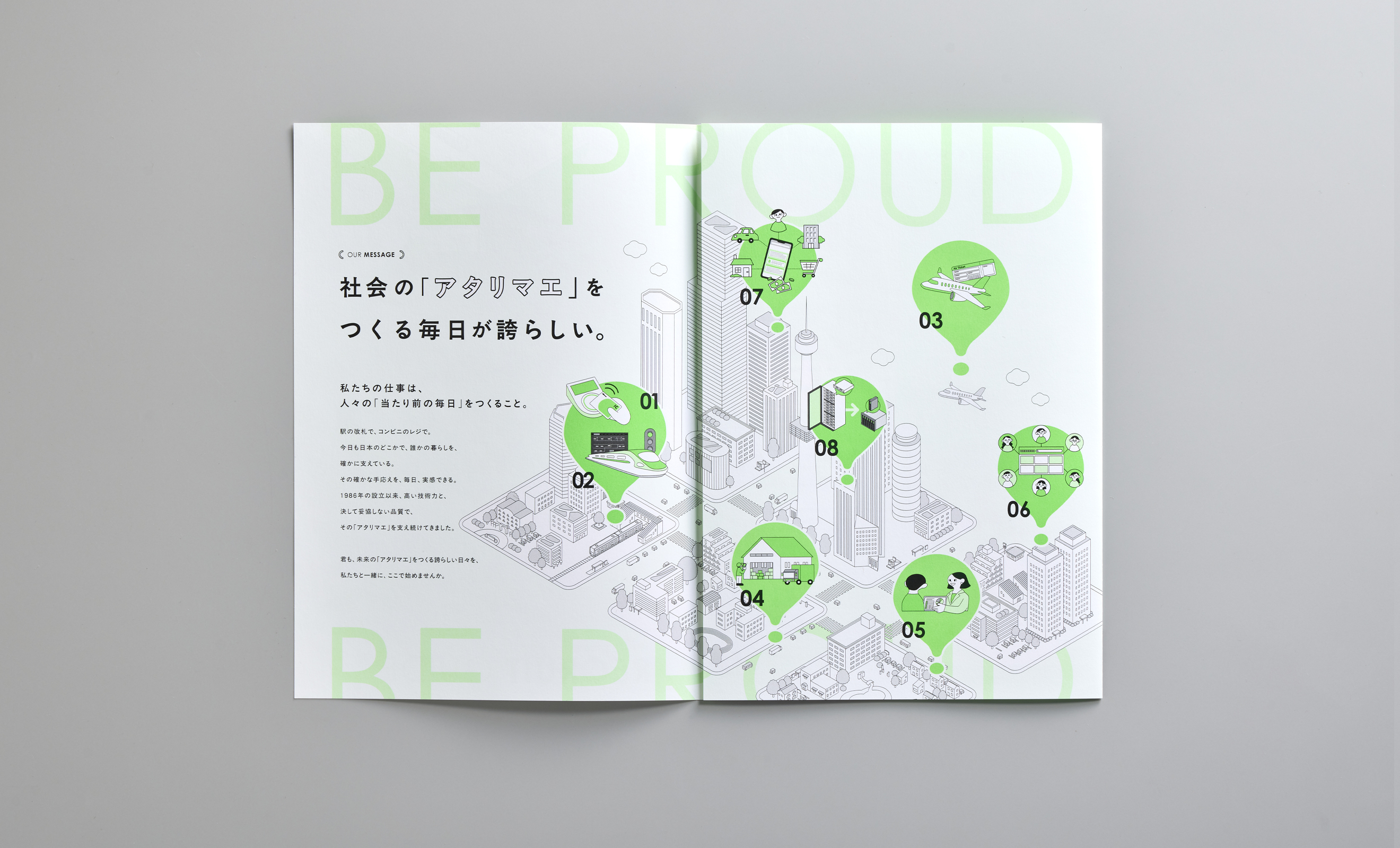 今回のパンフレットデザインは、同社の技術が日常に溶け込んでいる様子を表現するため、イラストをメインにしたものをご提案しました。特にポイントとなったのは、表紙を開いてすぐ、見開きで掲載した街を俯瞰するようなイラスト。「私たちの日常、私たちが暮らす街の中にエーアイテクノロジーの技術がある」という、仕事の規模の大きさ・重要さ・身近さを、ワンビジュアルで表現しました。また、ここに添えたキャッチコピー、「社会のアタリマエを創る毎日が誇らしい」も、エーアイテクノロジー様のユニークバリューを、ペルソナに響く言葉で表したものです。