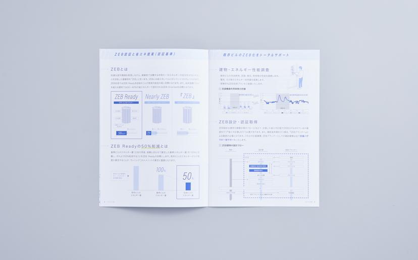 デザインに関しては、クライアントのコーポレートカラーであるブルーを基調として、ポイントにイエローを使いながら、スタイリッシュでスマートな印象に仕上げました。また、全ページにわたって図やイラストを多用し、ターゲットである「ZEBに詳しくない方」であっても興味を持って見てもらえて、理解できるように意識して作りました。