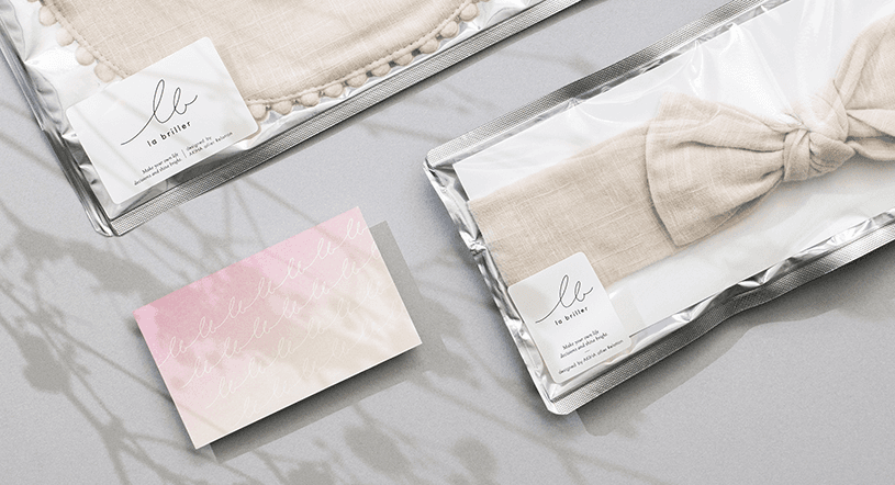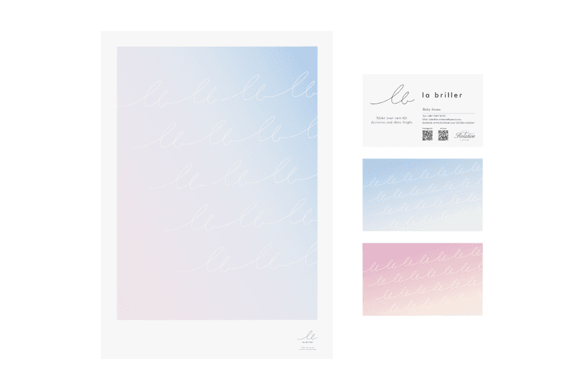 筆記体の文字がしなやかに連なるロゴマークは、シンプルだけれどこだわりのある「la briller」の世界観とつながる表現となりました。ポスターは、淡いグラデーションが上品な印象のビジュアルへと定着。繊細なグラデーションは、印刷時にトーンジャンプが起こりやすく、細かな調整を行いながら、美しい発色になるようこだわって仕上げていきました。