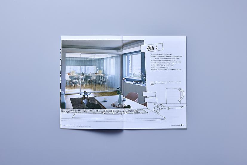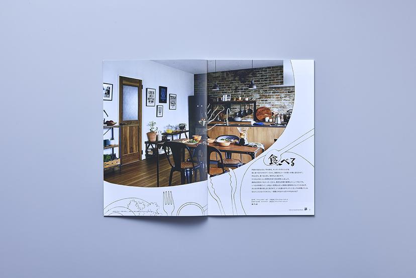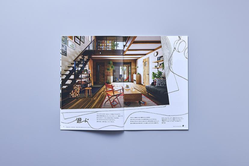 ライフスタイルという大きなテーマを<食べる・寛ぐ・遊ぶ・眠る・働く>という身近な5つのキーワードに細分化し、家の中で過ごす一日の流れに沿った前付けを入れることで、建てた先にある住む人の暮らしがより鮮明にイメージできる構成を提案しました。