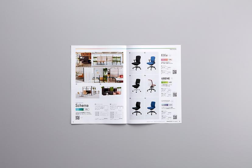 カタログの特集ページでは柔軟性や変化を感じさせる曲線をモチーフに取り入れ、商品掲載ページはシンプルにすっきりとした誌面としています。