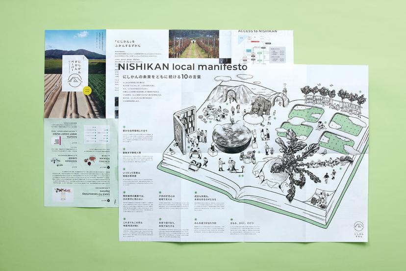 リーフレットの裏面では、ローカルマニフェストの内容を イラストで表現することに挑戦。 「にしかんエリア」に息づく 「暮らしの営み」「温かさ」「人間味」などが感じられるように、 手書きならではの血の通ったトーンでこの地に息づく文化や歴史、 地域の特性を“ずかん”の中にちりばめています。