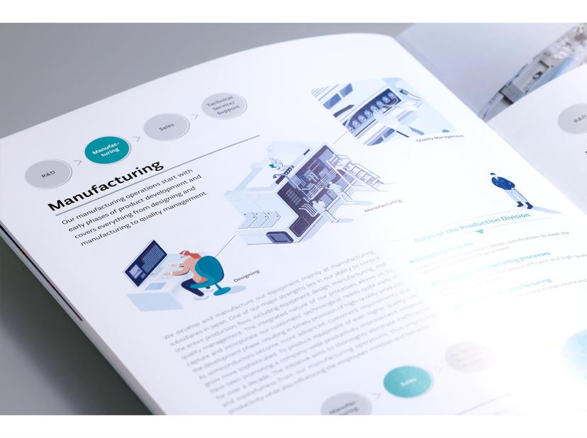 学生を中心とするステークホルダーに興味をもって事業内容を理解してもらうためにはどんな表現や誌面構成が良いか、多角的にアウトプットを考察。写真や言葉では説明しづらい革新的な研究開発の世界観や製造プロセスを表現するために、リアルで緻密な書き起こしから抽象的な表現までバランスを統一しながら、インフォグラフィックを大胆に用いてデザインしました。